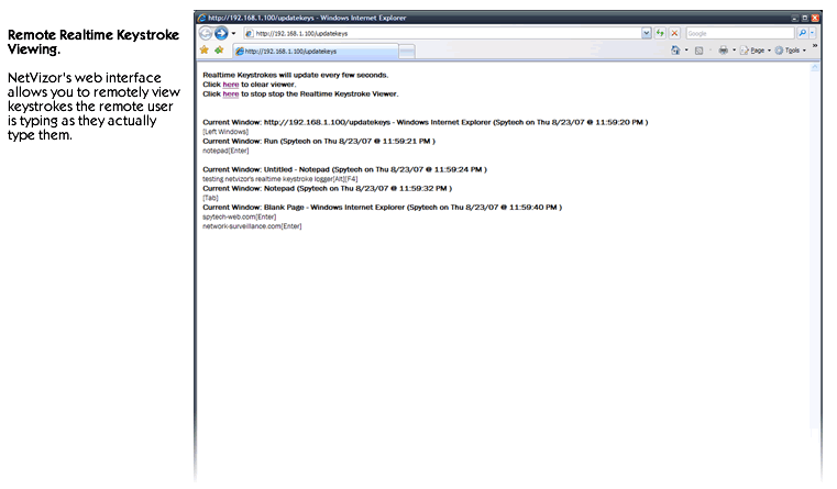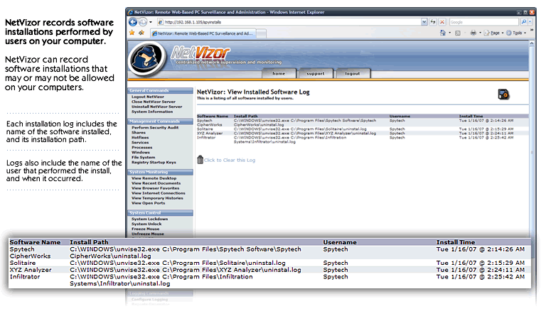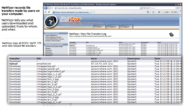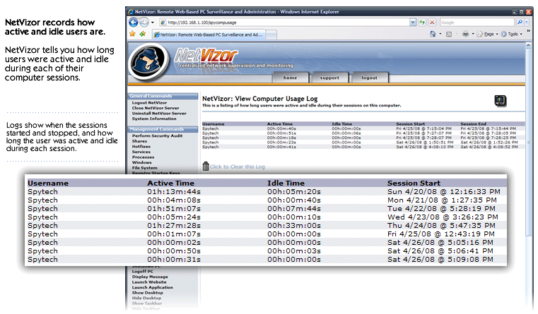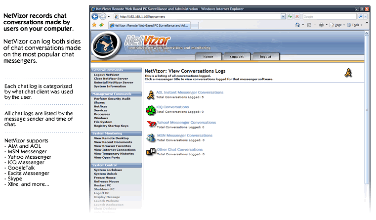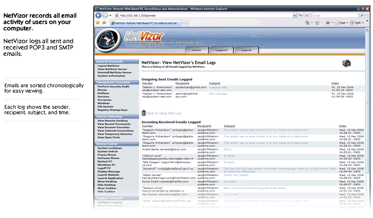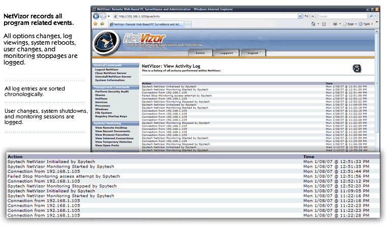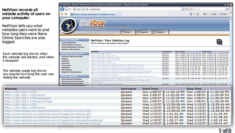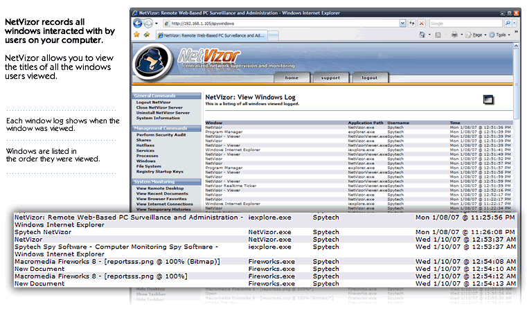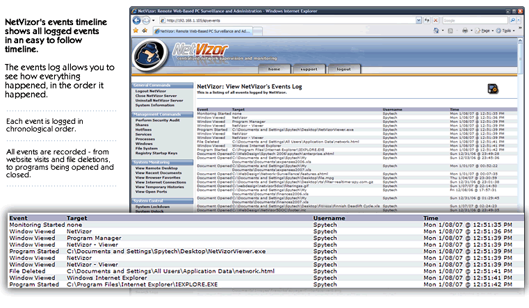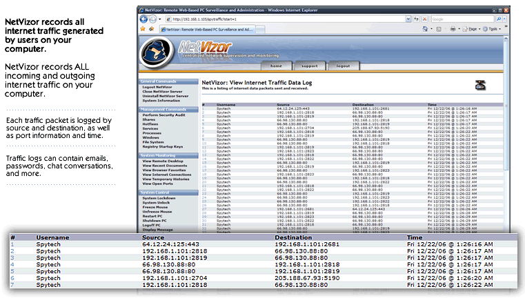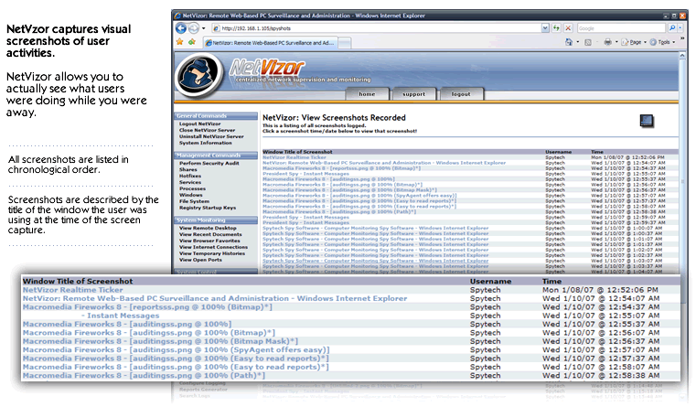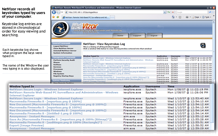 | NetVizor - Activity Monitoring and Surveillance FeaturesNetVizor centralized supervisor monitoring software logging capabilities are unmatched. NetVizor employee monitoring can log anything from what the user types, to emails sent/received and programs they ran - all time stamped by date for easy viewing. All logs are easily saved and exported for later use. All of NetVizor's logs can be remotely viewed from a central location for easy activity management! Keystroke Monitoring - Show Screen Remote Real Time Keystroke Viewing - Show Screen Emails Sent and Received - Show Screen Computer Usage Logging - Show Screen Events Timeline Logging - Show Screen Application Usage - Show Screen Website Activity - Show Screen Webmail and Website Content - Show Screen Internet Chat Conversations - Show Screen Internet Connections - Show Screen Internet Traffic Data - Show Screen Files Uploaded and Downloaded - Show Screen Documents Opened - Show Screen Print Jobs Executed - Show Screen Files System Usage - Show Screen Screenshot Capturing - Show Screen Window Activity - Show Screen Software Installations - Show Screen Remote Desktop Viewing - Show Screen Password Logging - Show Screen Activity Logging - Show Screen Remote System Information Viewing - Show Screen Remote Internet Connections Viewing - Show Screen Remote Recent Document History Viewing - Show Screen Real Time Remote Monitoring - Show Screen Remotely monitor off-network computers by having recorded activity logs (excluding chat and email logs) emailed to your email address. Guaranteed log delivery available when combined with our Stealth Email Service! |