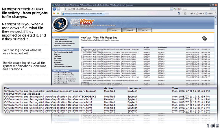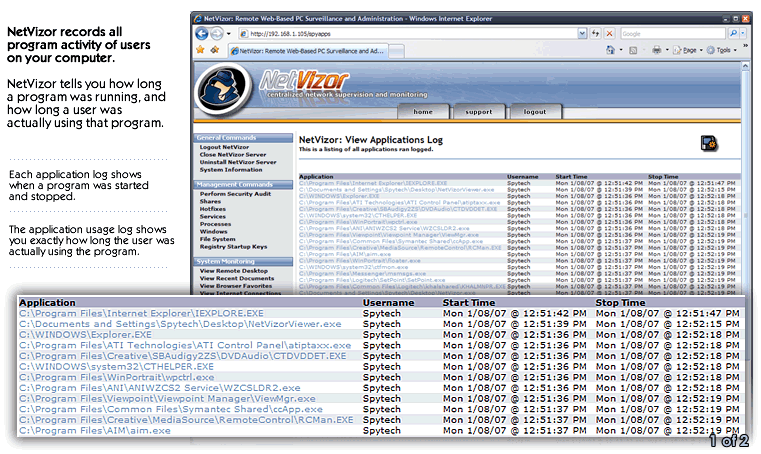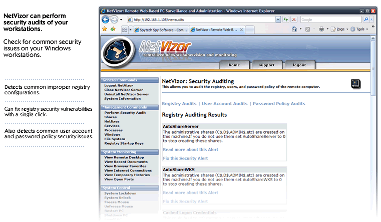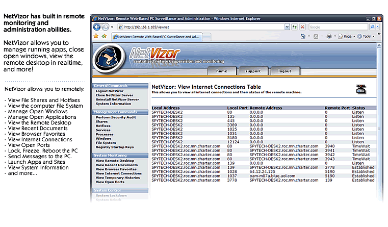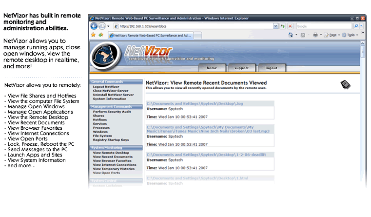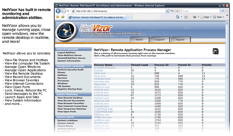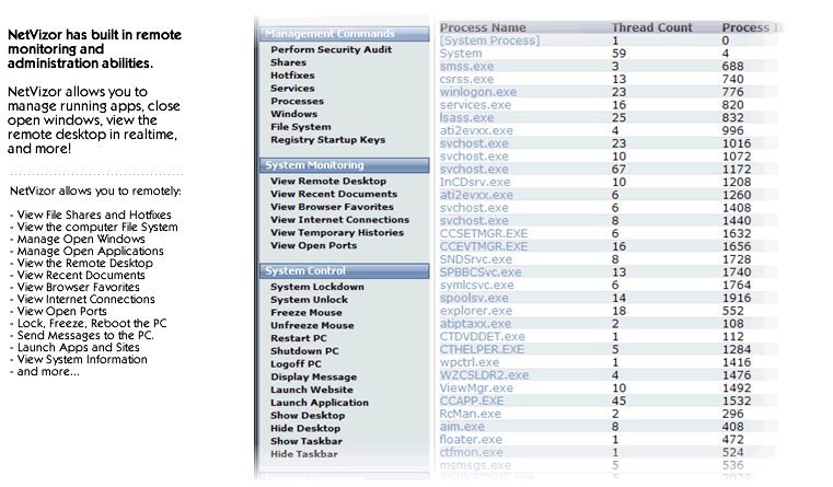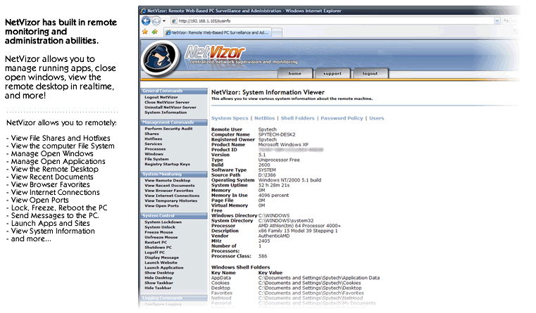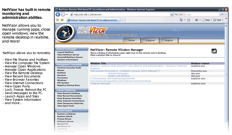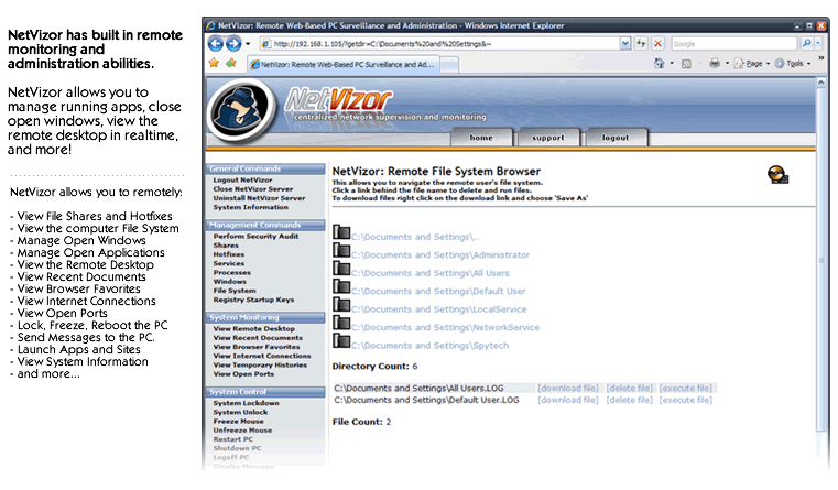 | NetVizor - Remote Administration FeaturesNetVizor has built in remote employee supervison features that allow the supervisor to remotely control remote workstations. NetVizor allows for remote workstation security auditing, remote application and windows management, file system browsing, system lockdowns, and more! Remote System Security Auditing - Show Screen Remote File System Navigation and Management - Show Screen Remote System Lockdown Control - Show Screen Remote Application/Task Management and Viewing - Show Screen Remote Open Windows Management and Viewing - Show Screen Remote System Mouse Freeze Control - Show Screen Remote Website and Application Launching - Show Screen Remote Message Display - Show Screen Shutdown, Restart, or Logoff the remote PC from your web-browser with NetVizor centralized supervisor monitoring! |