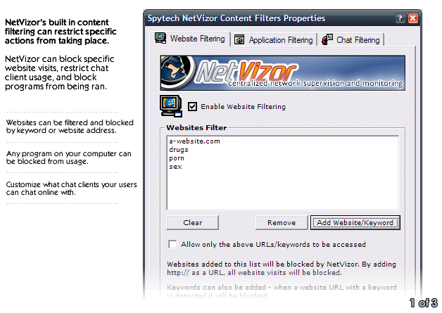 | NetVizor - Content Filtering and Instant Alert FeaturesNetVizor centralized supervisor monitoring not only acts as a powerful network monitoring and spy software solution, but also as a content filtering and activity alerting tool. NetVizor employee monitoring can filter websites from being visited, applications from being ran by the user, and even chat messengers from being used while NetVizor is active. Alerts allow you to respond instantly to unwanted behavior. Application Filtering - Show Screen Website Filtering - Show Screen Chat Filtering - Show Screen Portable Drive Blocking - Show Screen Instant Real Time Activity Alerts - Show Screen NetVizor can send instant activity alerts when: