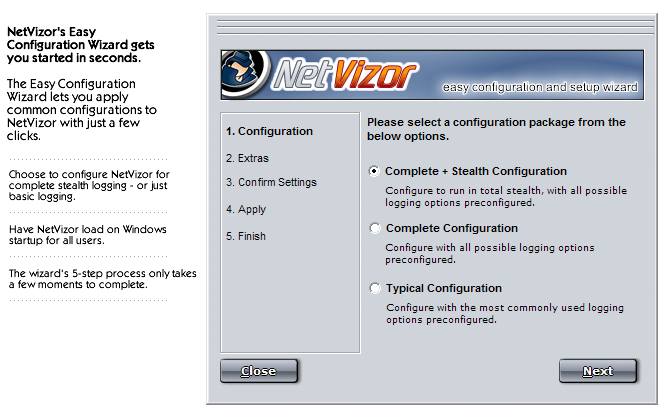 | NetVizor is Easy to Use!NetVizor has always been known as being extremely easy to use by a supervisor. You can have NetVizor setup and monitoring in seconds with its built in easy configuration wizard and intuitive graphical interface. NetVizor can even be tweaked to smoothly monitor slower PC's! Remote Network Installation and Removal - Show Screen Point and Click User Selection - Show Screen Intuitive Interface - Show Screen Setup NetVizor in seconds with the built in easy configuration wizard! |