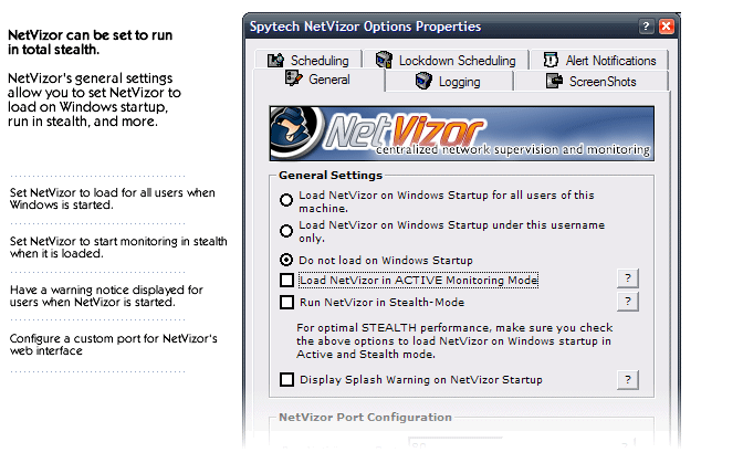 | NetVizor - Security and Stealth FeaturesNetVizor centralized supervisor monitoring software has a large array of security and stealth features. NetVizor is undetectable under all Windows versions (it does not even show up in the task manager on any Windows platform) and can circumvent popular third-party "spyware" detectors. NetVizor has powerful lockdown and logging scheduling features, optional startup warnings, and much more that will make a supervisor job much easier. Stealth-Mode - Show Screen Log File Encryption - Show Screen Logging Time Scheduling - Show Screen PC Lockdown Scheduling - Show Screen Warning Screen - Show Screen Password Protection - Show Screen Active Startup - Show Screen Windows Startup - Show Screen Idle Timeout AutoClear IP Allowance Configuration Access Restriction Configuration Configure NetVizor to disable popular spyware detectors that may interfere or detect NetVizor running! |