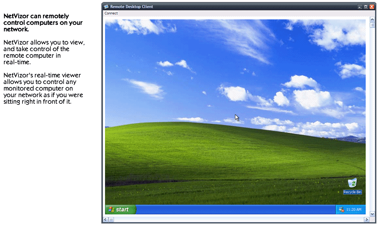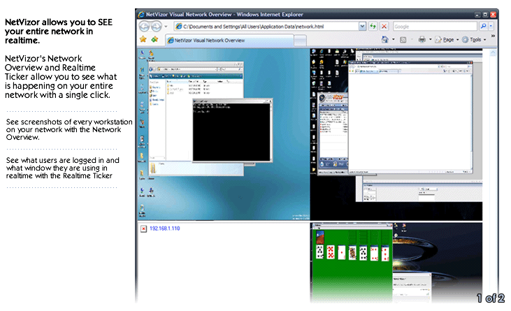 | NetVizor - Real Time Network Monitoring FeaturesNetVizor allows a supervisor to quickly, and easily view what is happening in real time on your entire network with a single click from one centralized location. A supervisor's connection to each specific workstation just to see what the remote users are working on is no longer necessary. Real Time Activity Ticker - Show Screen Visual Network Overview - Show Screen Launch remote control sessions with computers on your network. NetVizor allows you to take control of an employee's mouse and keyboard that has NetVizor installed from a supervisor's PC on the network.. |
