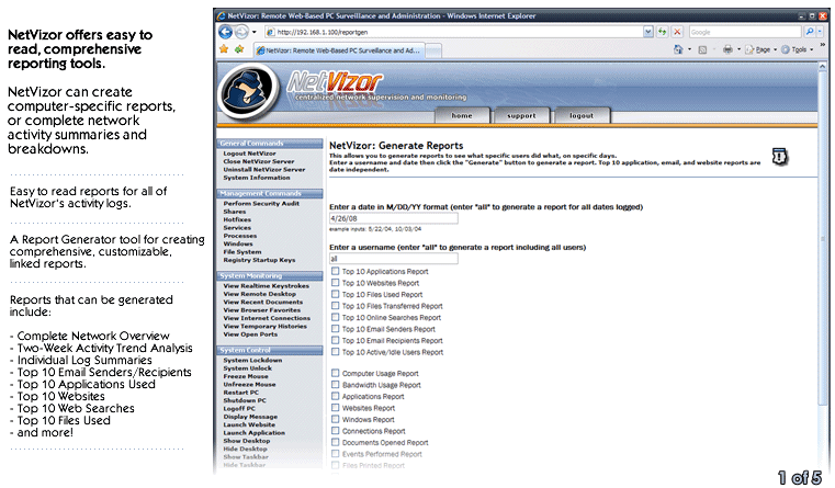 | NetVizor - Reporting and Log Management FeaturesNetVizor can log just about every move an employee makes - generating massive amounts of user activity information - so essential log management and reporting features are a must. To make log viewing and management a simple task, NetVizor centralized supervisor monitoring has built-in Top 10 report generators, summary reports, log cross-referencing, filtering, and search features. Extensive Report Generation - Show Screen NetVizor can create the following reports: