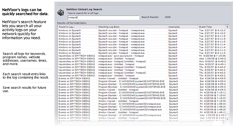 Log Cross-Referencing - Show Screen Quickly search a single employee's logs, or all computer logs on your network for specific keywords that may be contained in NetVizor's logs. |